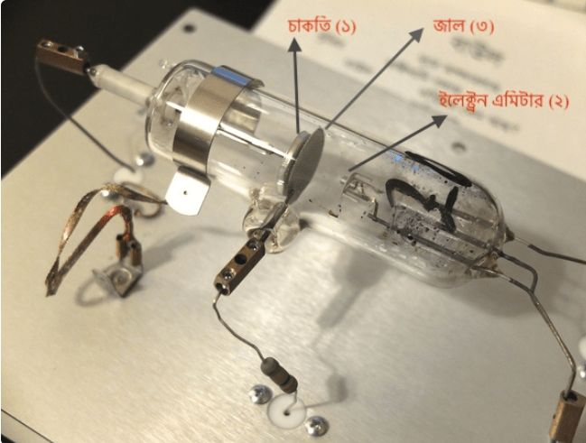 আমার কাছে একটা সীল করা কাঁচের টিউব আছে দেখো, যাতে ৩ টে মেটাল এর পাত বা জাল (ইলেক্ট্রোড) আছে । মানে একটা সাদা ‘চাকতি (১) ‘, একটা ‘ইলেকট্রন এমিটার” (২) (যা ইলেকট্রন ছাড়ে), আর সাদা চাকতির গায়ে গায়ে আছে একটা ‘জাল’ (৩), সঙ্গে ভেতরে একটু মার্কারি (পারদ) ফোঁটা দেওয়া আছে (ওই যে কাঁচের গায়ে লেগে থাকা চক চকে ছোট ফোঁটা গুলো) । চাকতি কে একটা ব্যাটারী এর নেগেটিভ লাগিয়েছি , জাল ও ইলেকট্রন এমিটার কে ব্যাটারী এর পজেটিভ এ লাগিয়েছি । এবারে বাইরে থেকে হেয়ার ড্রায়ার দিয়ে টিউব টা একটু গরম করলাম যাতে ভেতরের মার্কারি ফোঁটা গুলো বাস্প হয়ে গিয়ে গ্যাস হয়ে যায় । এবারে ঘরের লাইট নিভিয়ে ঘর অন্ধকার করে দিলাম । এবারে চাকতির নেগেটিভ ভোল্টেজ একটু একটু করে বাড়াচ্ছি, কিন্তু যেই ওই ভোল্টেজ ৪.৯ ভোল্ট হবে তখন জাল আর ইলেকট্রন এমিটার এর মধ্যে প্রথমে একটা নীল রং এর পটি (ব্যান্ড) দেখতে পাবে । এবারে আবার ভোল্টেজ বাড়াতে থাকলে আস্তে আস্তে পরের পটি (ব্যান্ড) তৈরি হবে এবং প্রতি ৪.৯ ভোল্ট পর, একটা করে নতুন পটি (ব্যান্ড) আসবে । মানে দ্বিতীয়টা আসবে ৯.৮ ভোল্টএ । এই পটিগুলো মার্কারির শক্তি পটি (এনার্জি লেভেল), সেই যে বিজ্ঞানী নিলস বোর কল্পনা (হাইপোথিসিস) করে যার তত্ত্ব বের করেছিলন । তার মানে মার্কারির শক্তি ঐরকম আলাদা আলাদা আলাদা পটি (মানে ডিসক্রিট) হিসাবে থাকে, একটানা থাকে না, একটানা থাকলে তুমি পুরো জায়গাটায় টানা আলো দেখতে পেতে, ওরকম ছাড়া ছাড়া পটি নয় । তাহলে চোখের সামনে দেখতে পেলে যে ওই মার্কারির শক্তি, পটি হিসাবে থাকে, মানে মার্কারির শক্তি কোয়ান্টাইসড মানে ডিসক্রীট (পটি হিসাবে) হিসাবে থাকে একটানা হিসাবে থাকে না । ব্যাপারটা একদম চোখের সামনে দেখা যাচ্ছে । আসলে হচ্ছে কি এখানে ইলেকট্রন মার্কারি পরমাণু কে ধাক্কা দিয়ে প্রথম শক্তি পটি থেকে (n =১) থেকে দ্বিতীয় শক্তি পটি (n =২) বা এনার্জি লেভেল এ তুলে দিচ্ছে, কিন্তু সেই মার্কারি পরমাণু আবার যখন প্রথম শক্তি পটি n=১ এ নেমে চলে আসছে তখন শক্তিটা আলো হিসাবে ছেড়ে দিচ্ছে বা যাকে বলে বিচ্ছুরিত করছে আর আমরা পটিগুলো চোখে দেখতে পাচ্ছি ।